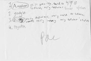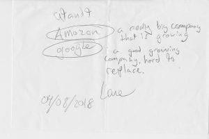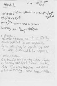 I made them rank the companies from hardest to replace to easiest. In my opinion, this question is one of the key tenets of investing. There are lots of good ideas and trends out there. But, if a company is easily replaceable, its economic strength will quickly be eaten away by competition. Warren Buffet calls this idea a company’s “moat.” It can lead to pricing power, where a company can raise prices over time with their customers remain customers. Sometimes pricing power comes on the back of love (Starbucks or Costco?), sometimes by force/coersion (Comcast?). Mia, Poe and Lane agreed that Disney was the hardest to replace, while Toyota and 21st century fox were probably the easiest. Savvy thinkers about business!